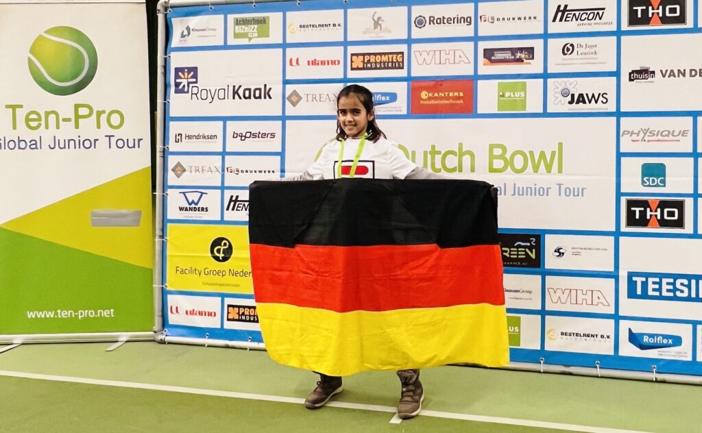 Die neunjährige Meera Shah von unserer TSG Herford hat beim Ten-Pro Dutch Bowl in den Niederlanden ihr erstes internationales Tennisturnier bestritten – und gleich einen beeindruckenden Einstand gefeiert. In ihrem Debütspiel konnte sie sich gegen ihre Gegnerin aus Irland durchsetzen und ihren ersten Sieg auf internationalem Parkett feiern.